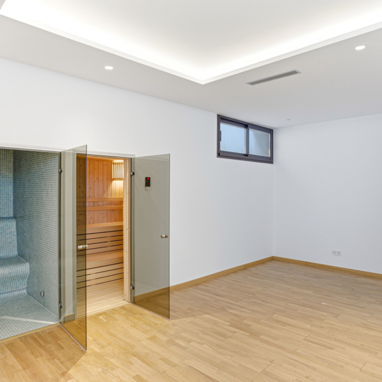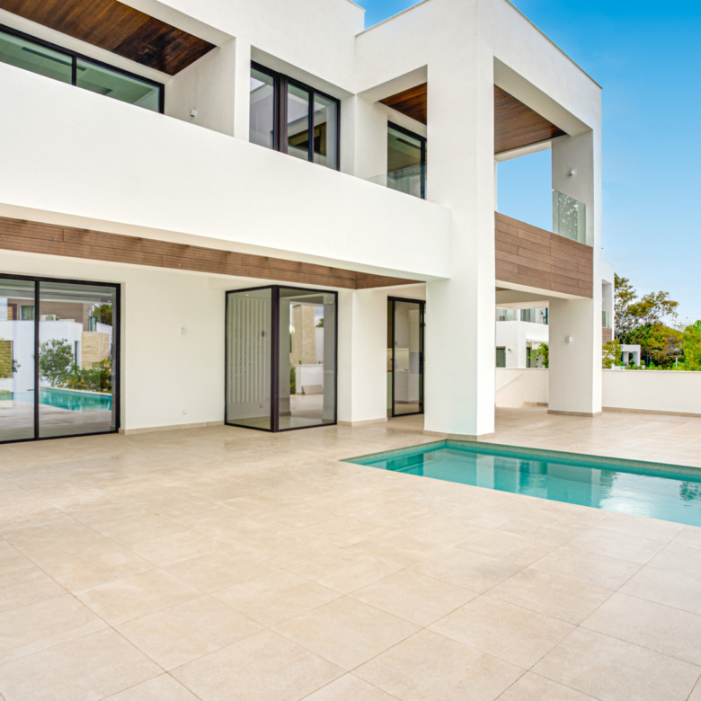 Modern four bedroom villa with southeast orientation and exceptional qualities located in a gated community, consisting of only 15 villas, with 24 hour security guards and concierge services situated in a green oasis on the edge of the famous Golden Mile, just a few meters from the beach, a few minutes walk from the old town of Marbella, bars and restaurants. The property can be customized to offer you exactly what you desire, be it a private gym, spa, cinema and entertainment area. The villa includes four bedrooms and four bathrooms, a spacious living room, an open plan kitchen equipped with the highest quality furniture and appliances, a private elevator connecting each level of the property, underfloor heating and a rooftop solarium with beautiful views towards the sea. Both the garden and pool will be centrally maintained by the community and the construction of the villa is expected to be completed by the end of 2022.