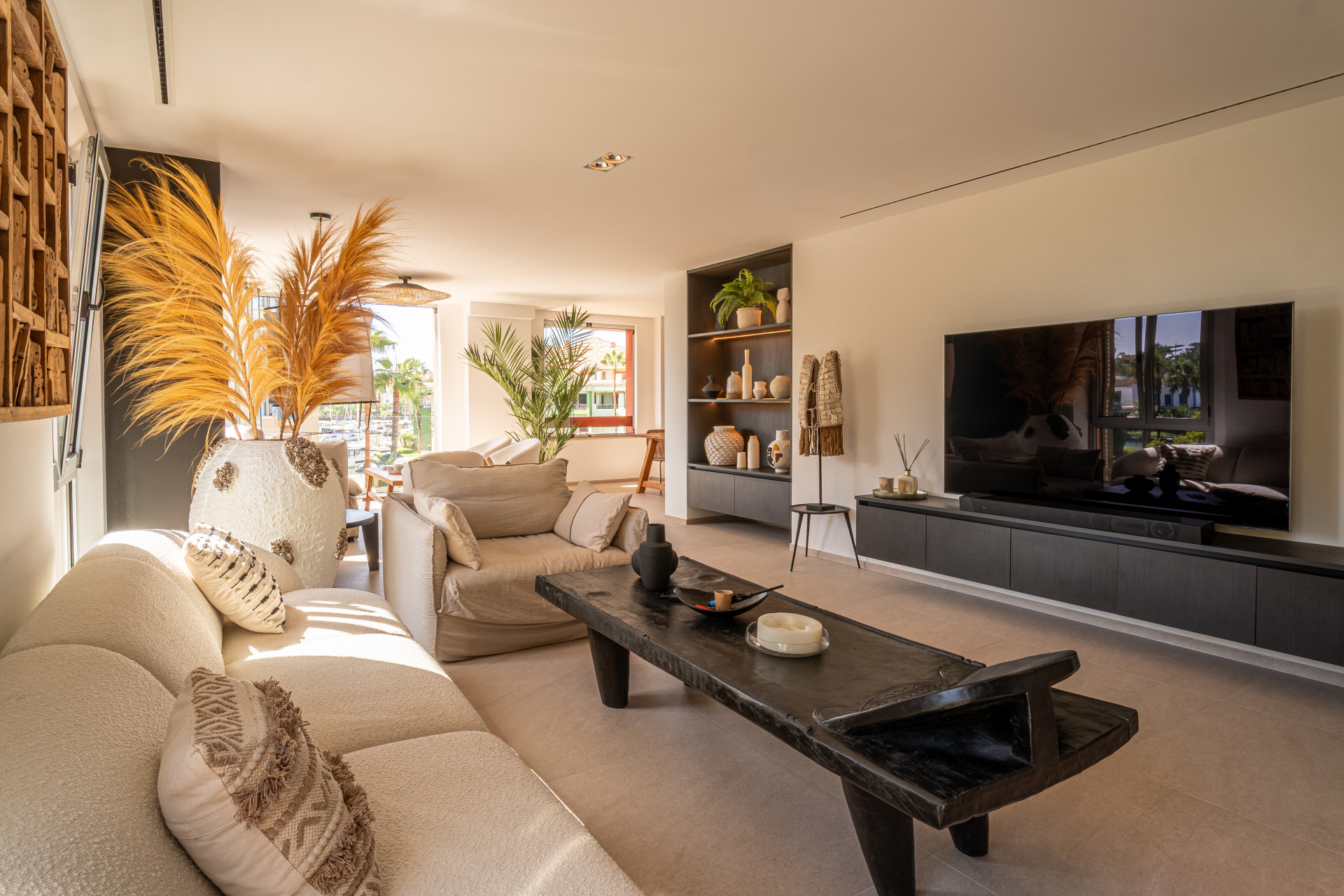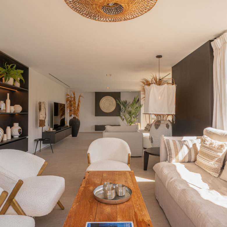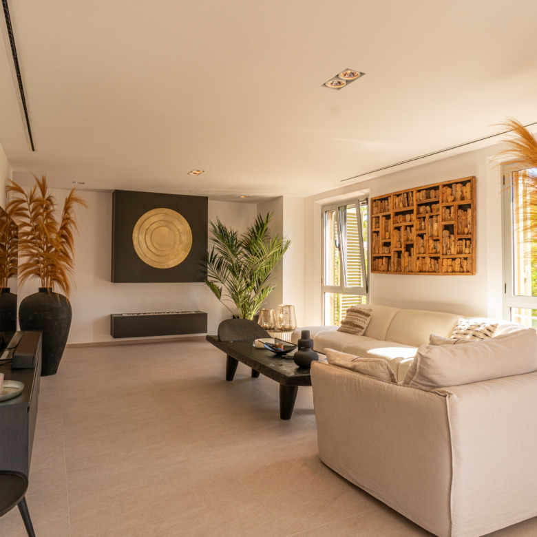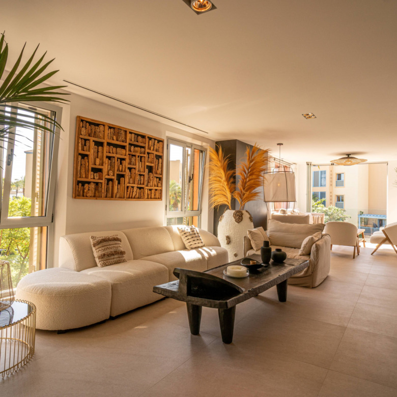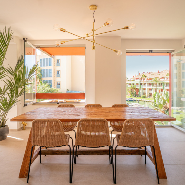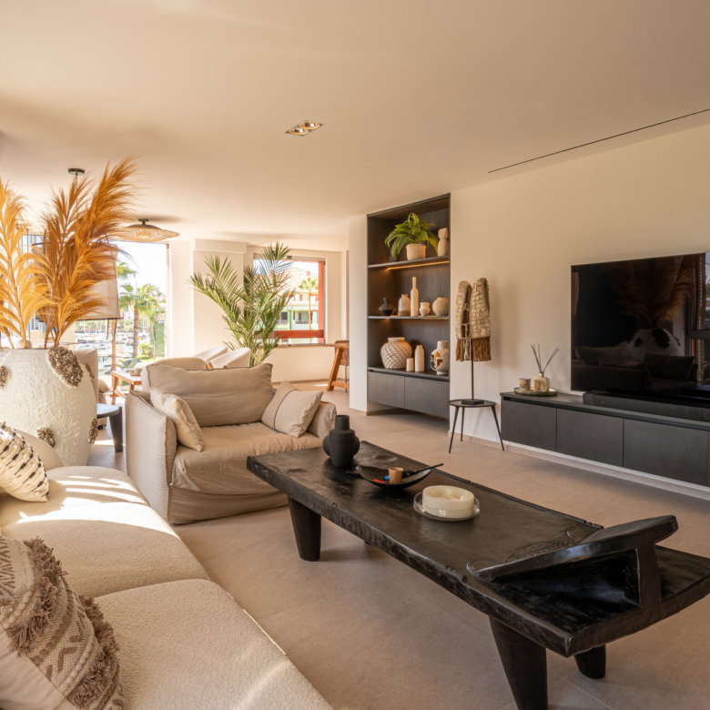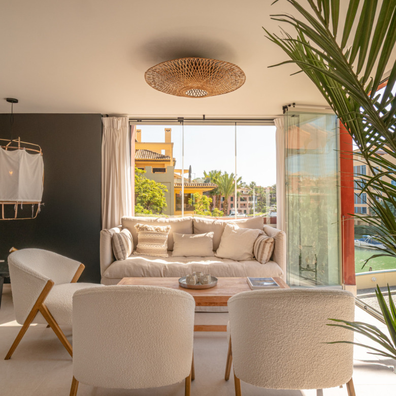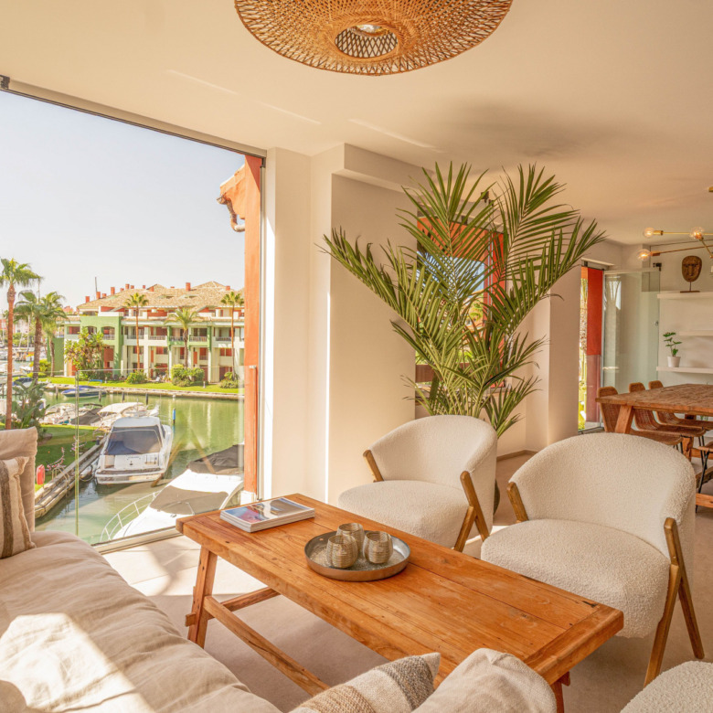 This three-bedroom apartment is located in the popular Ribera de la Romana residential complex in Sotogrande Marina, within walking distance of the port with all its restaurants, shops, and the Sotogrande beach. The apartment has been completely renovated with great attention to detail and high-quality finishes. Spacious and open-plan, the apartment has a total of 211 square meters. The bright entrance area is inviting and opens into the spacious living area with a stylish oil fireplace. To the front, there is a further lounge and dining area, which is flooded with light thanks to the fully opening windows and offers fantastic views of Sotogrande marina. The new high-quality fitted kitchen is open to the dining area and all the technical appliances are of the highest quality, such as Smeg appliances from the Dolce & Gabbana line. The apartment has three bedrooms, all with fitted wardrobes and en-suite bathrooms. A particular highlight is the spacious master bedroom, which has a walk-in wardrobe with glass doors and indirect lighting, as well as an open-plan bathroom with a large walk-in shower and a floating bath. Everything in the apartment is of the highest quality and is being sold fully furnished. Other features include: new Daikin air conditioning, a special indirect lighting system throughout the apartment, a storage room, and an underground parking space.