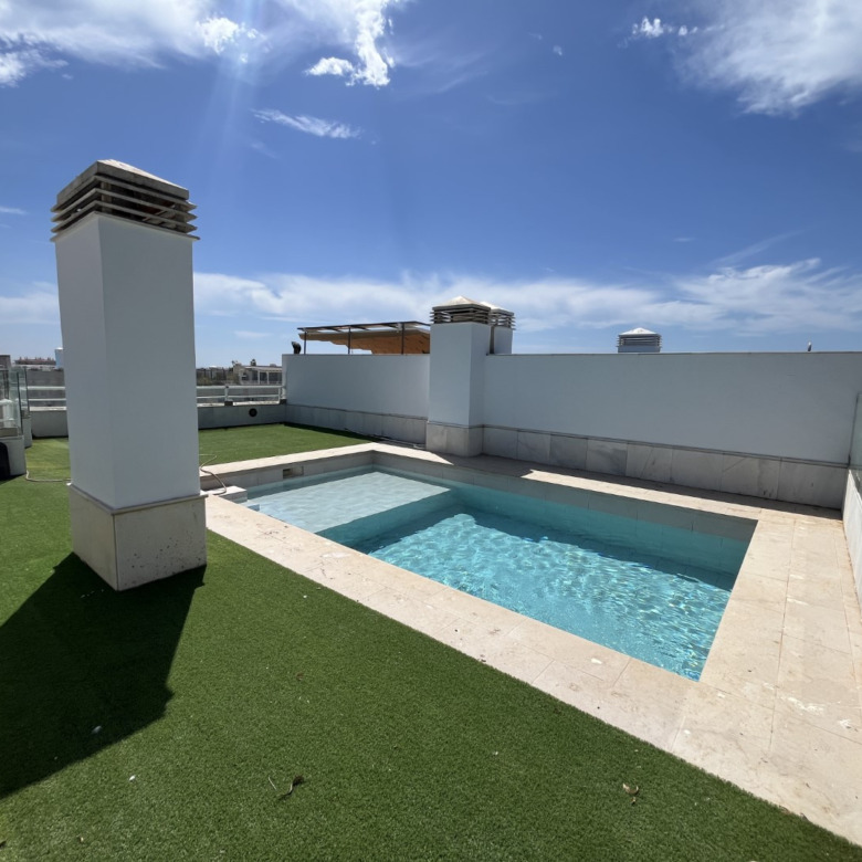 Solarium level: summer kitchen, three bedrooms (two en-suite), three bathrooms, spacious solarium terrace with private pool, barbecue area, and stunning open views. The pool is equipped with a lift chair for people with reduced mobility, and the duplex also features a private stair lift for convenient access between floors.