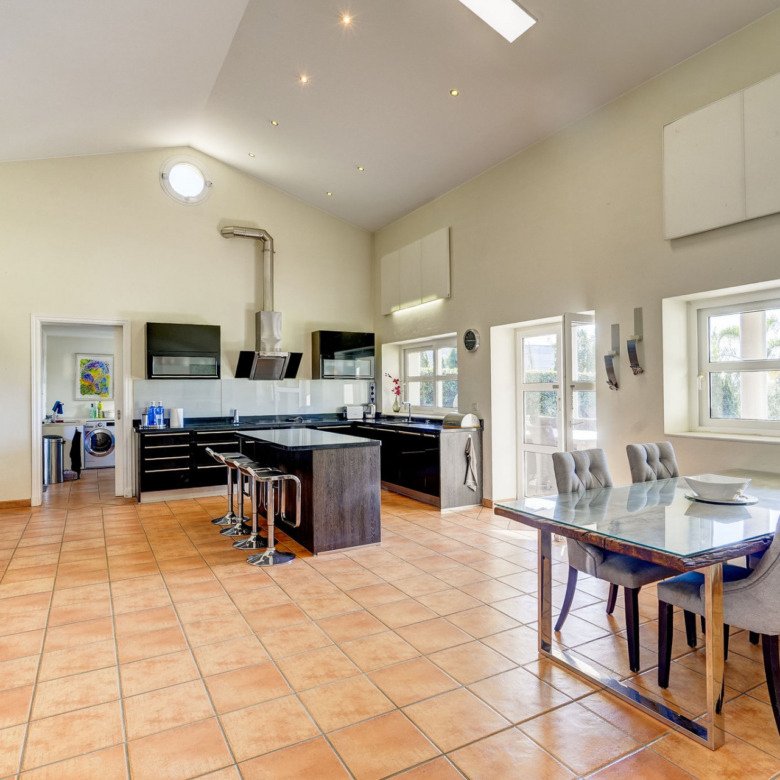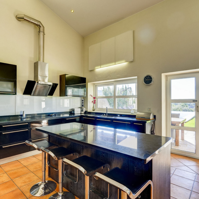 The modern family kitchen is generously sized and features direct access to a beautiful terrace with a barbecue area—ideal for outdoor dining and entertainment.