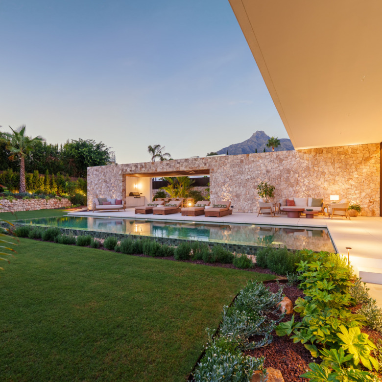 Las zonas exteriores incluyen jardines bien cuidados y una zona de piscina con salón, comedor y cocina al aire libre.