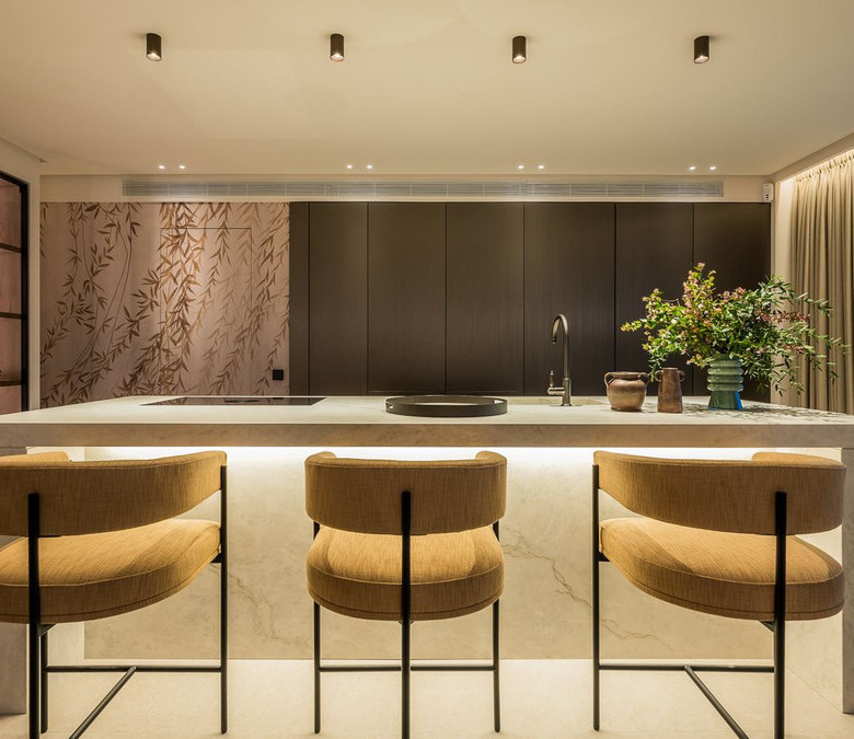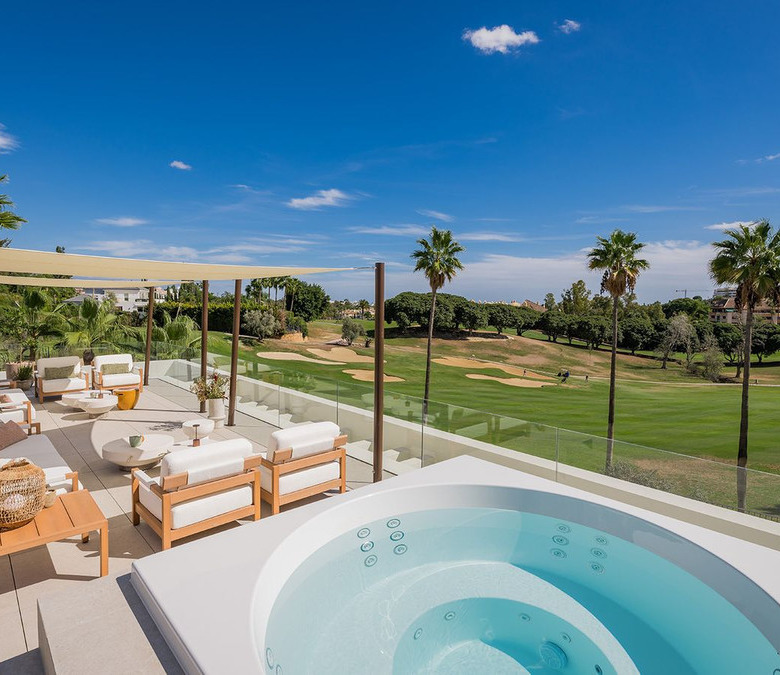En la misma planta, encontrarás 4 dormitorios en suite, cada uno con su terraza privada. La suite principal, de casi 40 m², ofrece un vestidor y un baño de diseño abierto que te hará sentir en una lujosa suite de hotel. La zona exterior es un oasis de relajación con varias áreas de descanso, detalles de agua y una piscina que se fusiona con las vistas al golf. Además, cuenta con un garaje para buggies con acceso directo al campo.