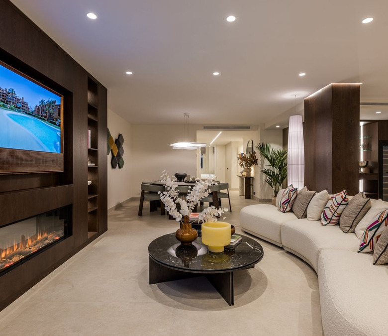 Cada detalle del apartamento ha sido meticulosamente diseñado, desde el sistema de sonido de última generación Bang & Olufsen y la chimenea eléctrica del salón, hasta los armarios a medida y la cómoda bañera exenta. El dormitorio principal cuenta con un televisor de techo invisible y una acogedora chimenea de bioetanol para una relajación total. Conduce a un impresionante baño en suite con bañera exenta, que ofrece el espacio perfecto para relajarse con privacidad y comodidad.