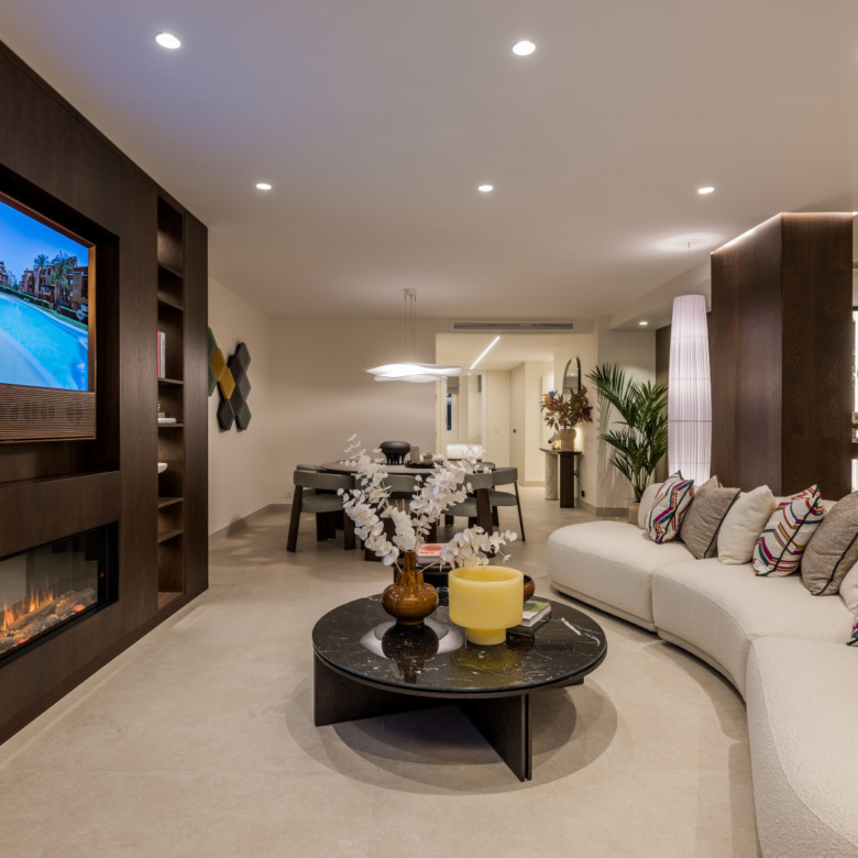 El apartamento, orientado al sur, ofrece vistas directas al mar y una abundante luz natural. La zona de estar de concepto abierto incluye un salón generoso con un cómodo área de estar, smart TV y acceso directo a una terraza privada con jardín bien cuidado.