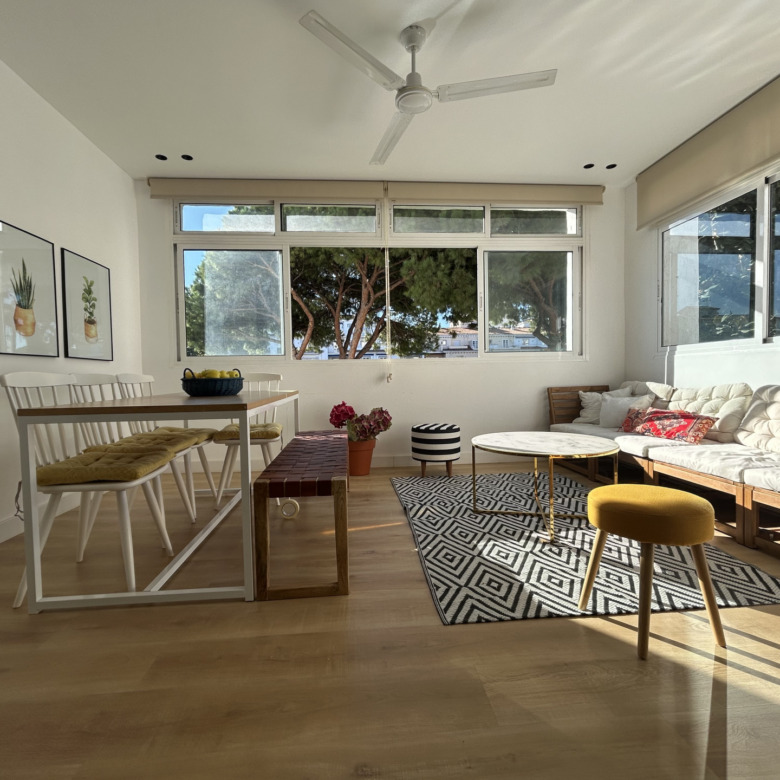 Oportunidad !!!! super precio; Apartamento de 2 dormitorios y un baño con vistas al mar y orientación al oeste, sol de tarde. Recientemente Reformado. Esta situado en la prestigiosa urbanización en Playas del Duque. Cuenta con bonito salón y La cocina equipada e integrada en el salón. La terraza es acristalada y tiene el comedor y otra zona de estar . Las vistas son al paseo peatonal de Lola Flores y a su lateral, el mar. Es todo exterior y haciendo esquina. Está impecable tiene todas las comodidades entre ellas Aire acondicionado y plaza de Garaje incluido en el precio perfecto para entrar a vivir y excelente como inversion.