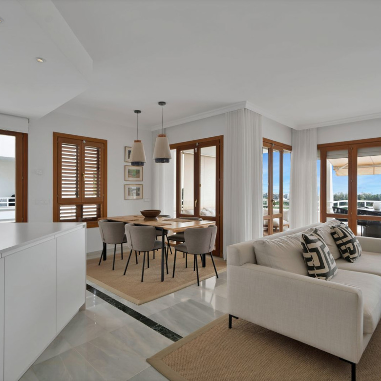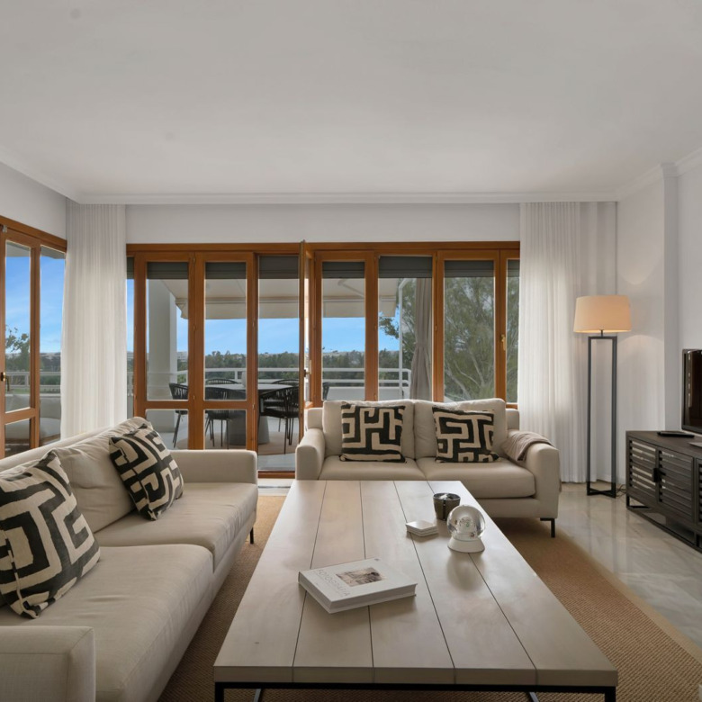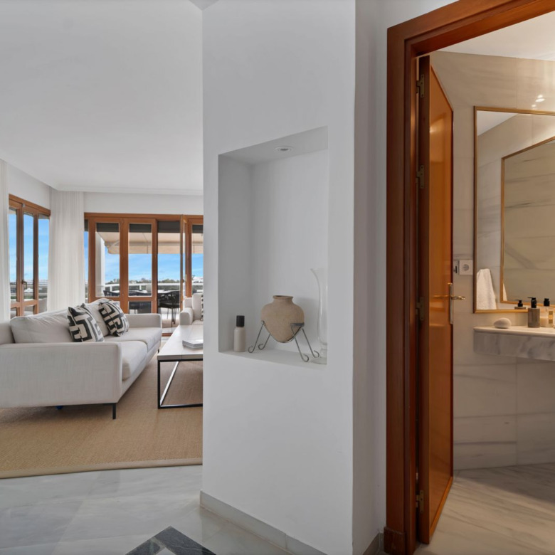 Vivir en primera línea de golf con todas las comodidades: este apartamento orientado al oeste, situado en planta media de la exclusiva urbanización cerrada de Alcores del Golf, en Nueva Andalucía (Costa del Sol), ha sido objeto de una reciente reforma integral que combina ubicación privilegiada y diseño cuidado.