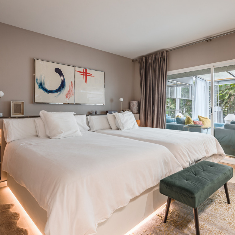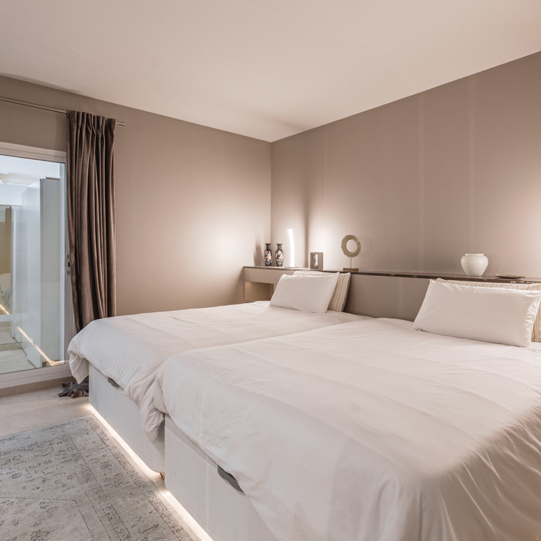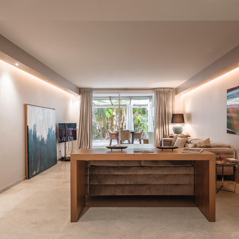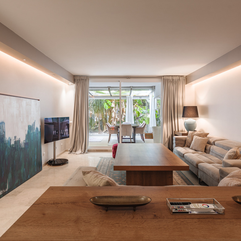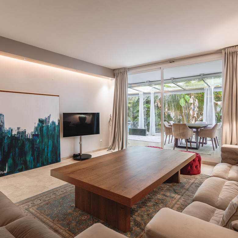 Apartamento en planta baja exquisitamente presentado, situado en una urbanización con seguridad 24 horas en Las Lomas del Marbella Club, en el corazón de la Milla de Oro. La propiedad ha sido completamente renovada y aprovecha al máximo toda su distribución de planta abierta que une la cocina, el salón y la gran terraza al aire libre, a la perfección. Los grandes ventanales del suelo al techo se abren desde el salón a un exuberante jardín tropical y a una terraza cubierta con cortinas de cristal ajustables que pueden abrirse en los meses de verano para proporcionar un increíble espacio de ocio dentro de un entorno muy privado. El apartamento aprovecha al máximo los metros cuadrados y ofrece dos amplios dormitorios, cada uno con su propio baño en suite. El dormitorio principal se abre y conecta con la gran terraza hacia la parte trasera de la vivienda. El complejo ofrece una piscina exterior con maravillosas vistas al mar, gimnasio y sauna para los residentes. La propiedad incluye 1 plaza de aparcamiento y un gran trastero. Situada en una zona muy cotizada, aproximadamente a mitad de camino entre Marbella ciudad y Puerto Banús.