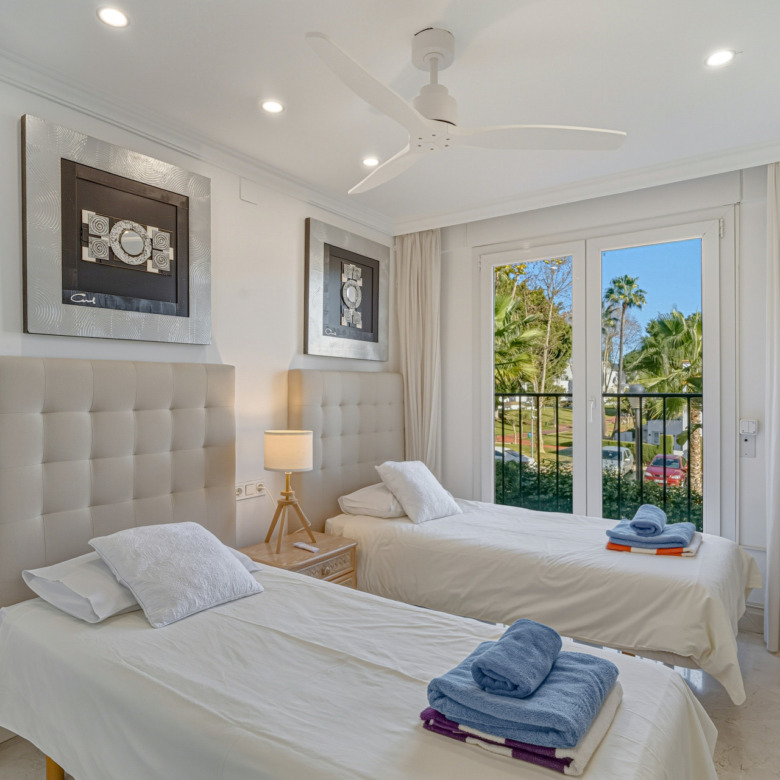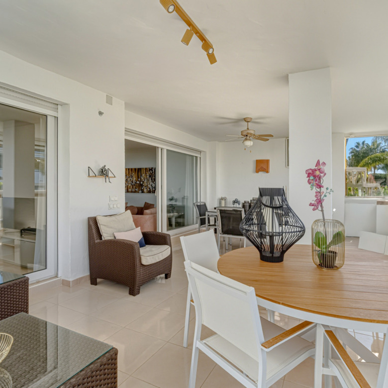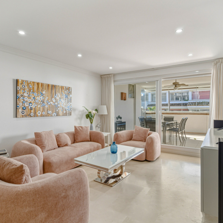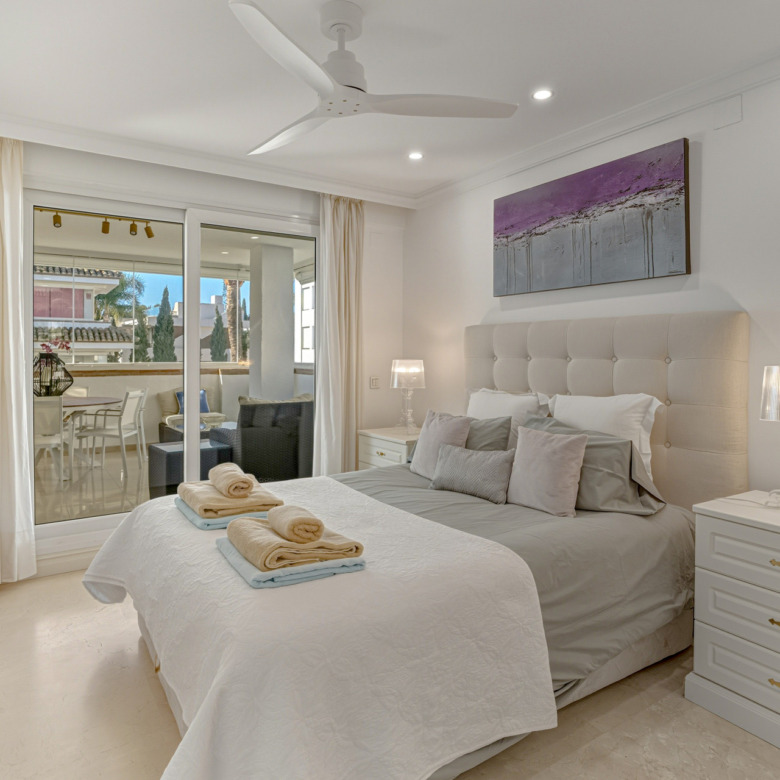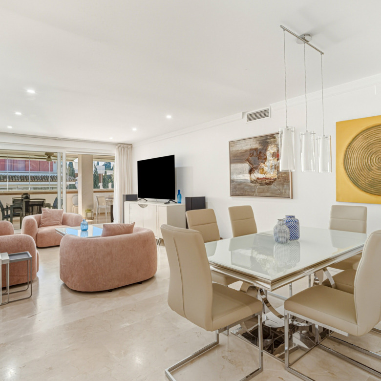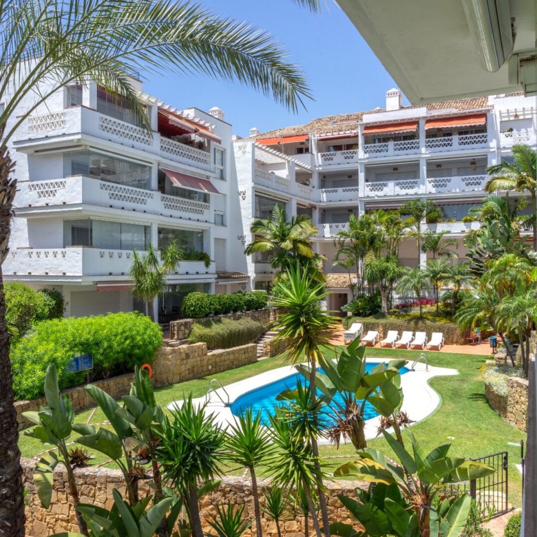 Excelente, totalmente renovado, apartamento de tres dormitorios en primera planta en Milla de Oro de Marbella, en la codiciada comunidad de playa Las Cañas Beach, con servicio de seguridad 24 horas, varias piscinas comunitarias y jardines tropicales. Además de estar a pocos pasos de muchos bares, tiendas y restaurantes. Casablanca Playa, una de las mejores de la costa, está justo fuera de la puerta principal. El apartamento tiene una amplia sala de estar y comedor con puertas francesas que conducen a la terraza privada que está rodeada de curtianos de vidrio; cocina totalmente equipada; suite principal con acceso a la terraza; dos dormitorios y un baño de invitados. Otras características incluyen aire acondicionado frío y caliente, y armarios empotrados.