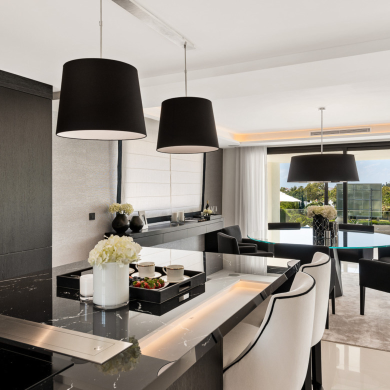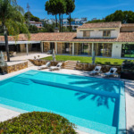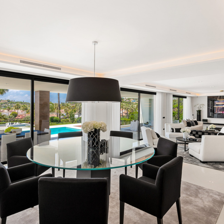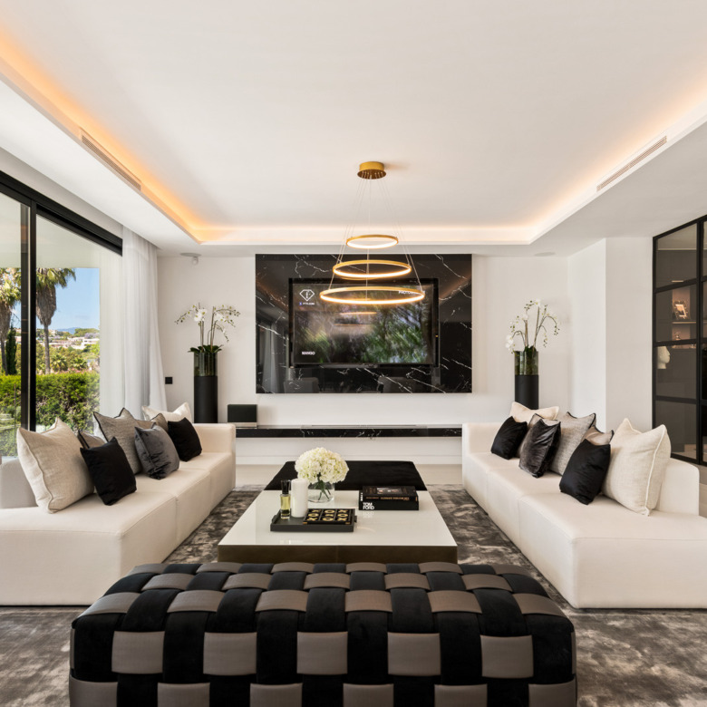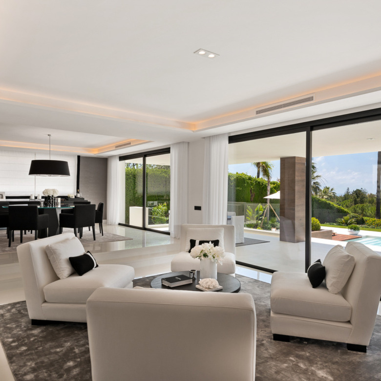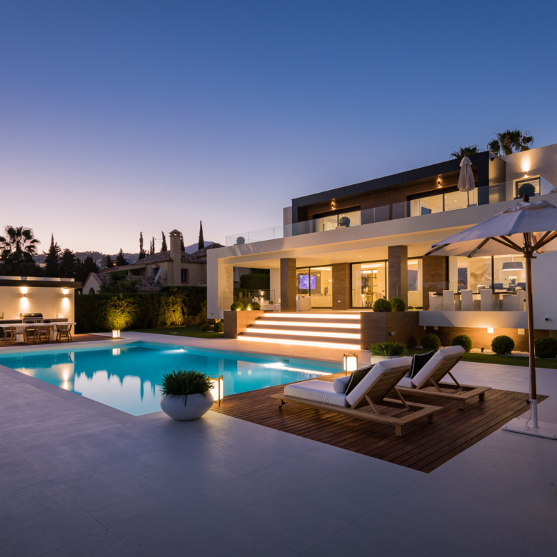 Espectacular villa diseñada por un conocido arquitecto galardonado con varios premios ubicada en un entorno privilegiado en el corazón del Valle del Golf de Nueva Andalucía, una de las zonas residenciales con más demanda de la Costa del Sol. Esta villa con orientación suroeste se distribuye en tres niveles e incluye, a nivel de entrada: luminoso vestíbulo que conduce a un gran salón de planta abierta dividido en tres zonas de estar, cocina de diseño italiano totalmente equipada con electrodomésticos Gaggenau y comedor. Todo lleva a un amplio porche, al precioso jardín con una impresionante zona de chill out y fuentes, a la piscina climatizada de gran tamaño con ducha exterior y amplio espacio para tomar el sol y a la cocina de barbacoa al aire libre, todo con impresionantes vistas al campo de golf. Arriba: dormitorio principal con un enorme y elegante armario, baño en suite y acceso a una terraza ideal para disfrutar de las vistas incluso desde la bañera; suite adicional; 2 dormitorios con baño compartido. Todos los dormitorios incluyen amplios armarios empotrados de roble. Nivel inferior: 2 dormitorios más; lavadero; bodega; gimnasio y sala de cina. Construida con mejores calidades y acabados, incluidos baños con accesorios de Dornbracht, entre otros. Una ubicación tranquila, sin ruidos, en una parcela elevada frente al campo de golf. Situada a tan solo unos minutos en coche del famoso Aloha College y de Aloha, con su gran selección de restaurantes, bares y servicios. A tan solo 5 minutos en coche de Aloha Golf, Las Brisas Golf, La Quinta Golf, Magna Marbella Golf y de una amplia selección de pistas de tenis y pádel. A 10 minutos en coche de Puerto Banús, de la playa y de la Milla de Oro de Marbella.