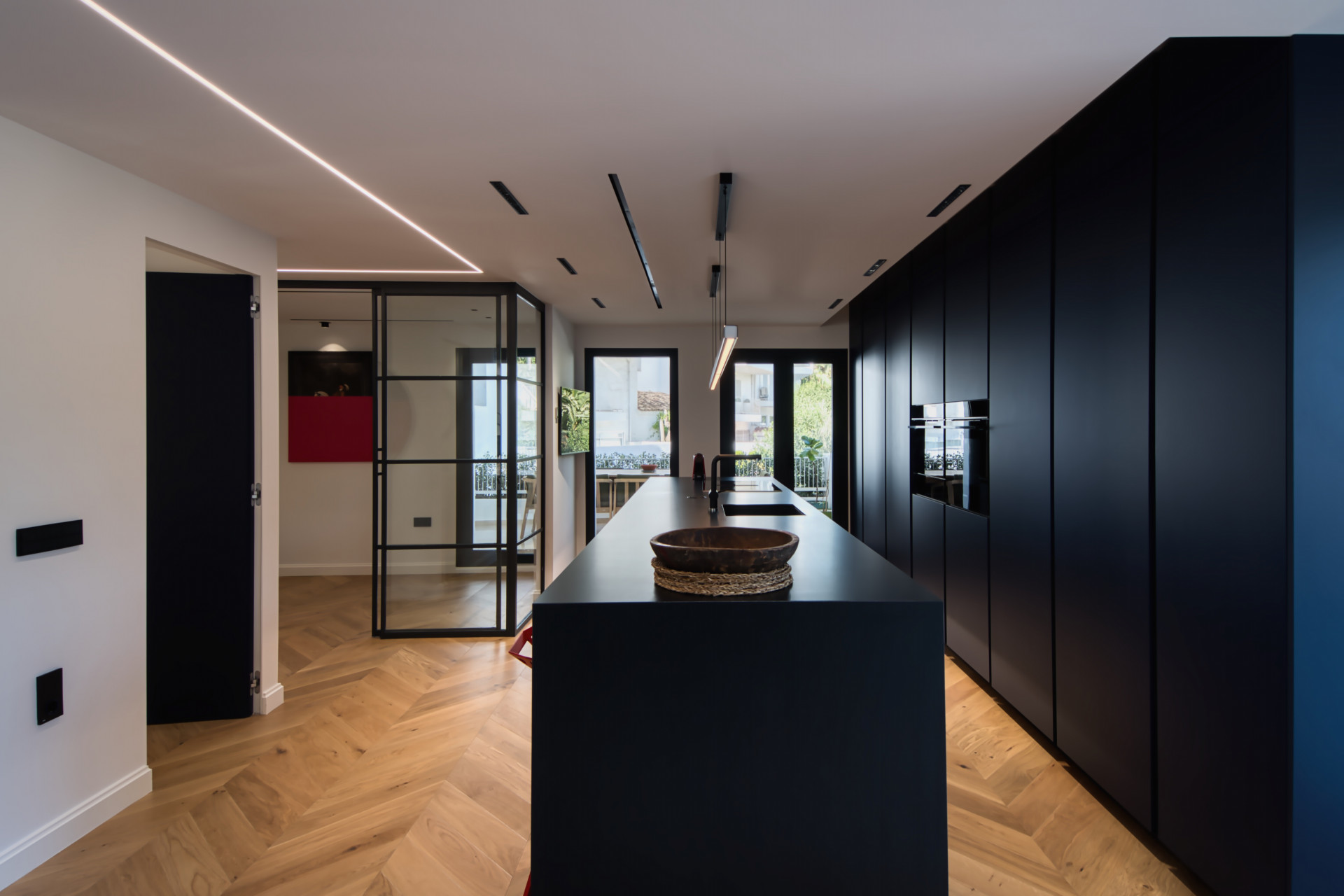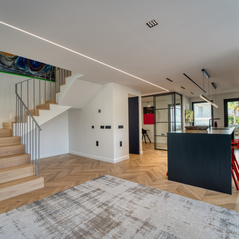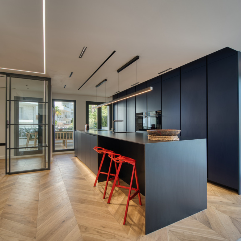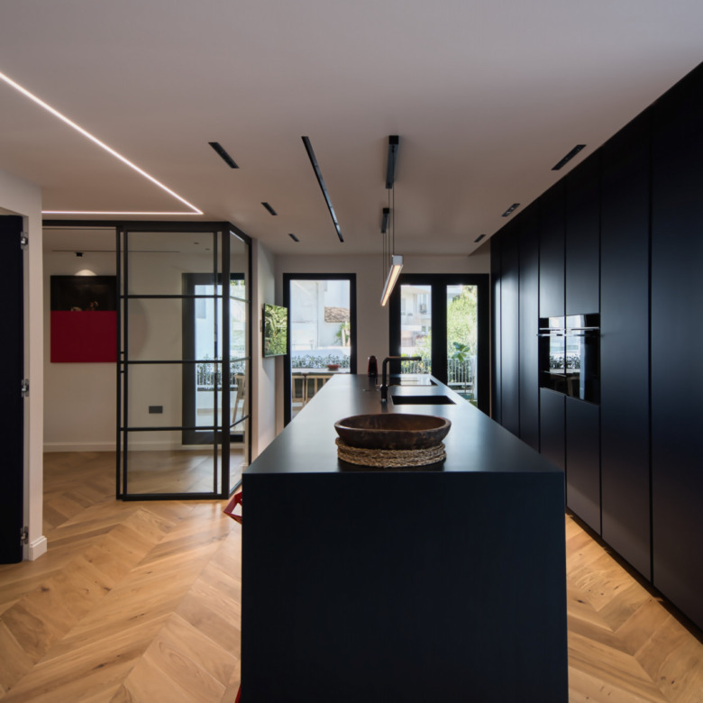 Una luminosa sala de estar diáfana que fluye a la perfección hacia una moderna cocina totalmente equipada, perfecta para recibir invitados o relajarse con la familia.