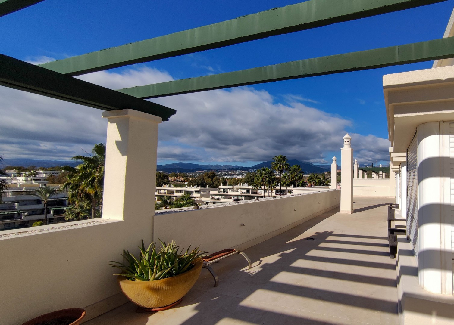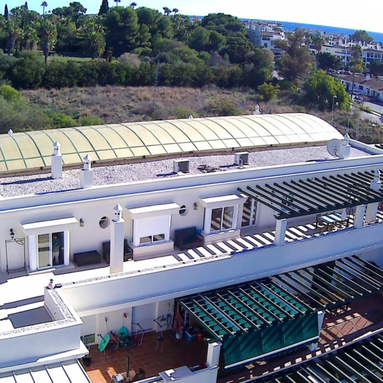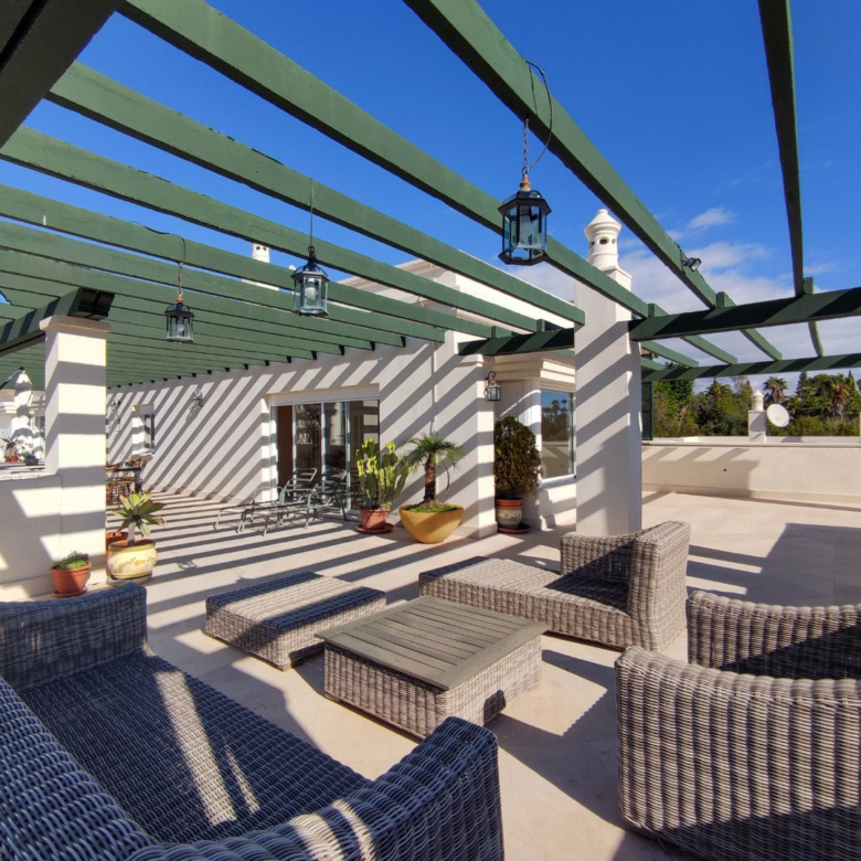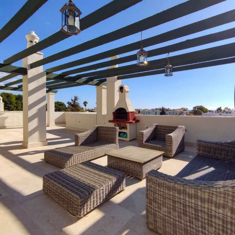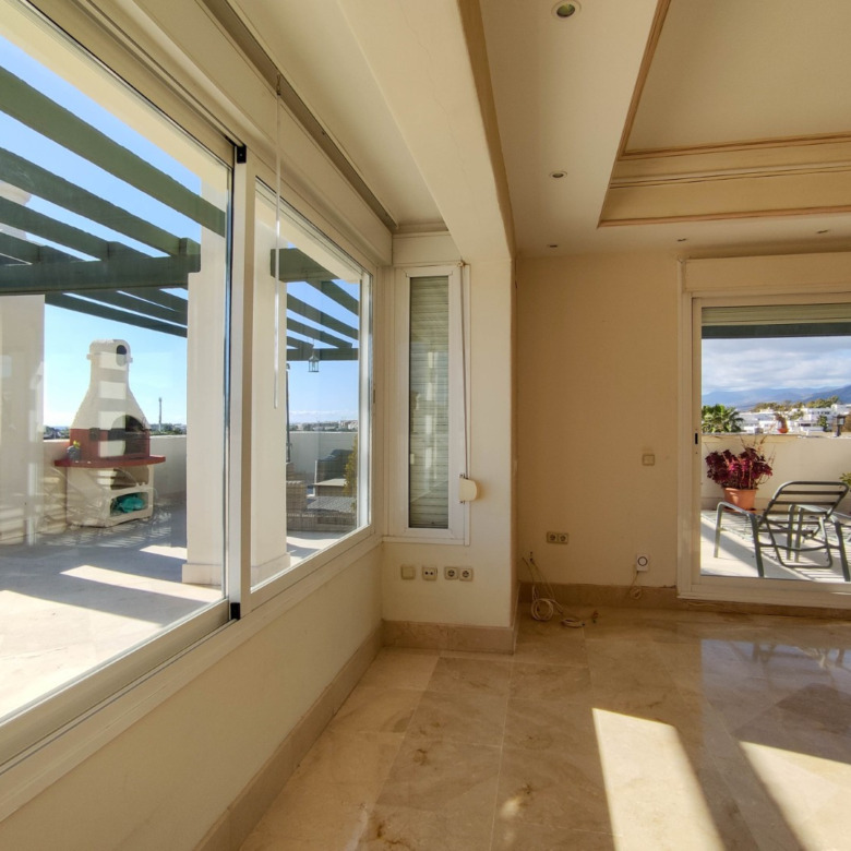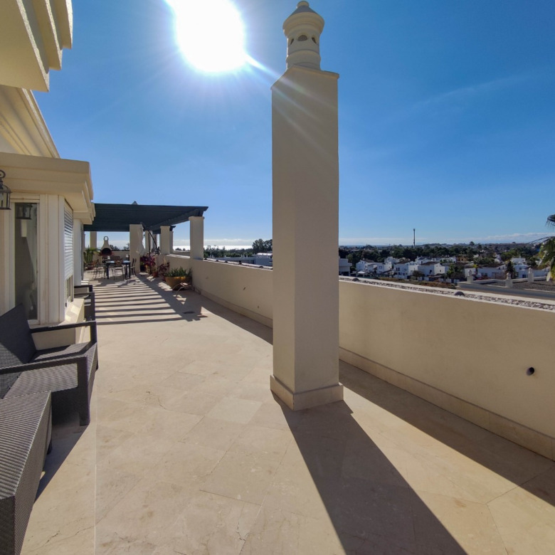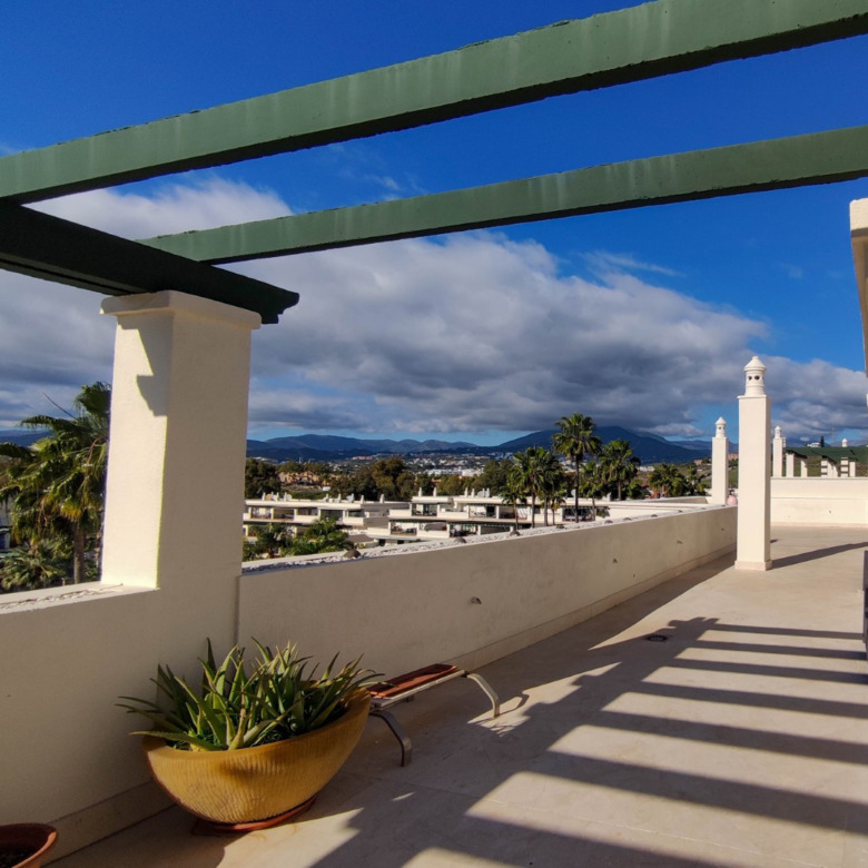 El verdadero privilegio de esta residencia reside en su impresionante terraza de generosas dimensiones. Este espacio exterior se convierte en un refugio de absoluta privacidad, una cualidad difícilmente replicable en desarrollos nuevos. Desde este punto elevado, la mirada se extiende sin obstáculos, ofreciendo un lienzo panorámico inigualable: desde las majestuosas siluetas montañosas hasta el resplandor sereno del Mediterráneo. Es el escenario ideal para el entretenimiento discreto y el disfrute del clima de la Costa del Sol.