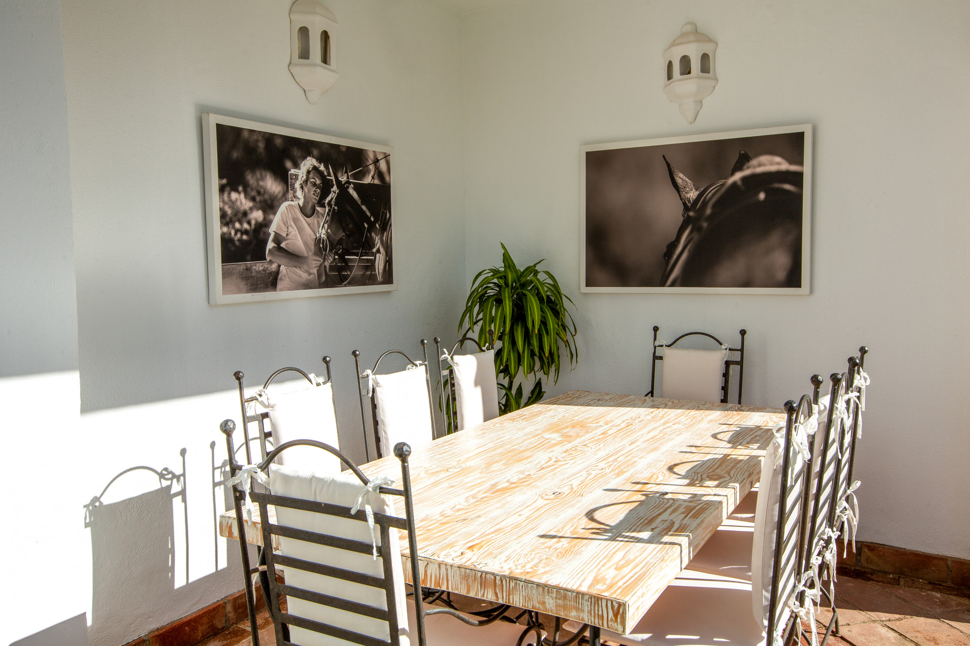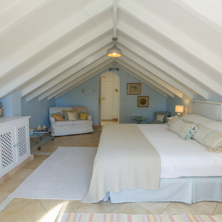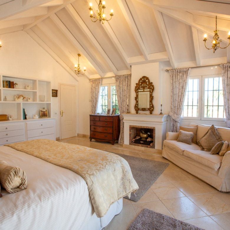El imponente hall de entrada de doble altura conduce a un amplio salón presidido por una chimenea de gran carácter, ideal tanto para recibir invitados como para disfrutar de veladas íntimas. La villa cuenta con cinco dormitorios en suite más un cuarto de servicio, todos con armarios de madera a medida. La suite principal se distingue además por su acogedora chimenea.