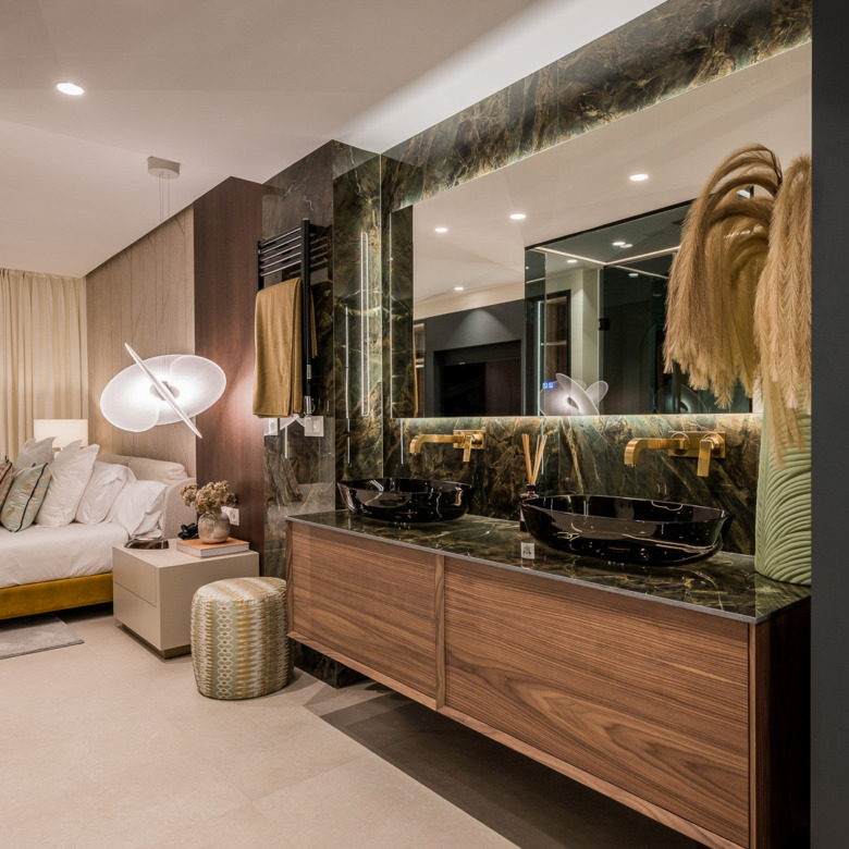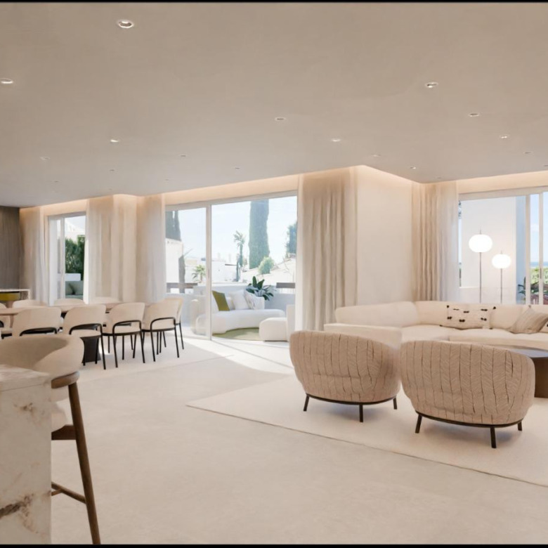 El apartamento cuenta con 6 dormitorios y 4 baños en una distribución generosa y luminosa. Su orientación suroeste inunda los interiores de luz natural, mientras que las terrazas ofrecen impresionantes vistas a los jardines subtropicales, el mar Mediterráneo, la montaña de La Concha y el cercano campo de golf.