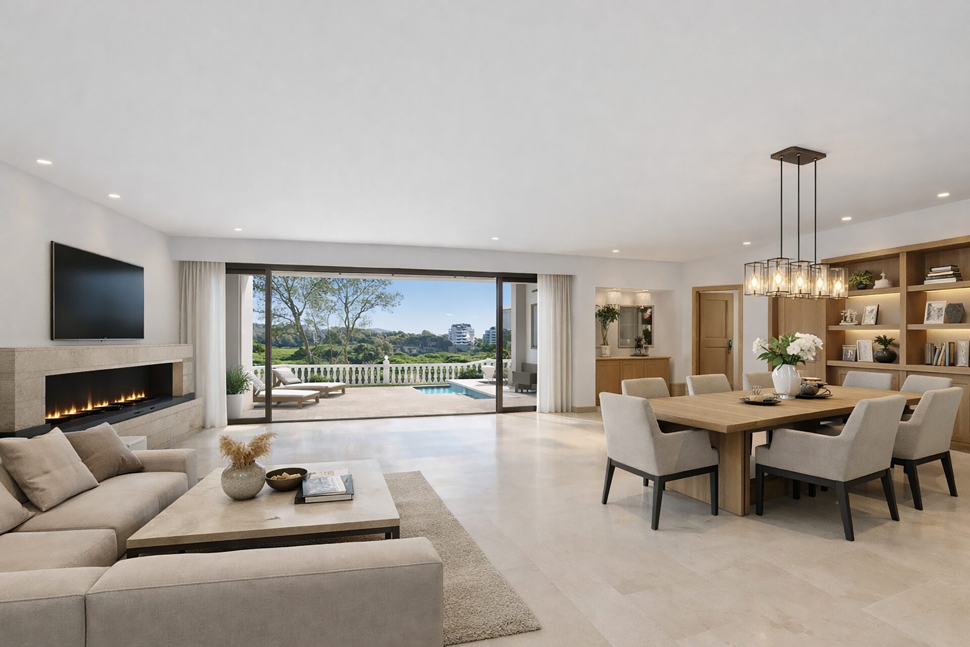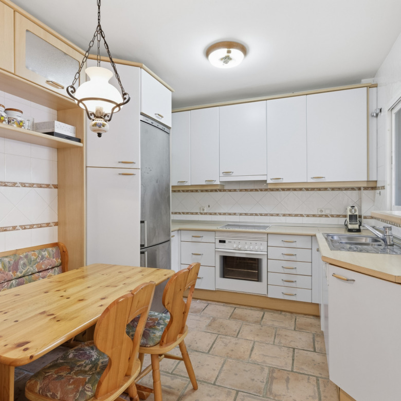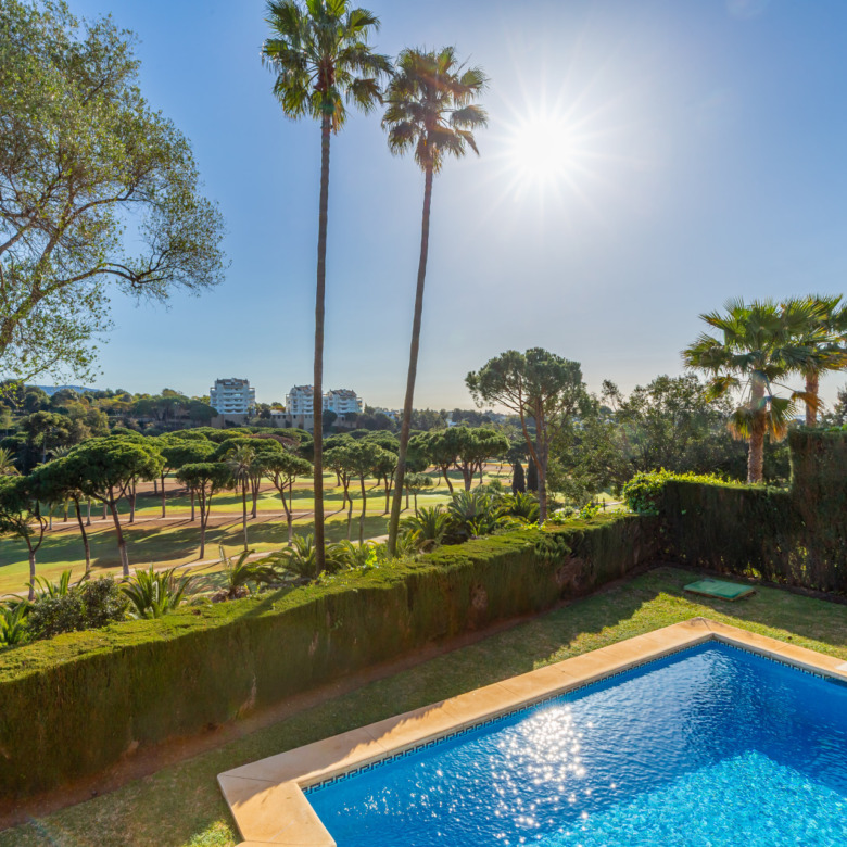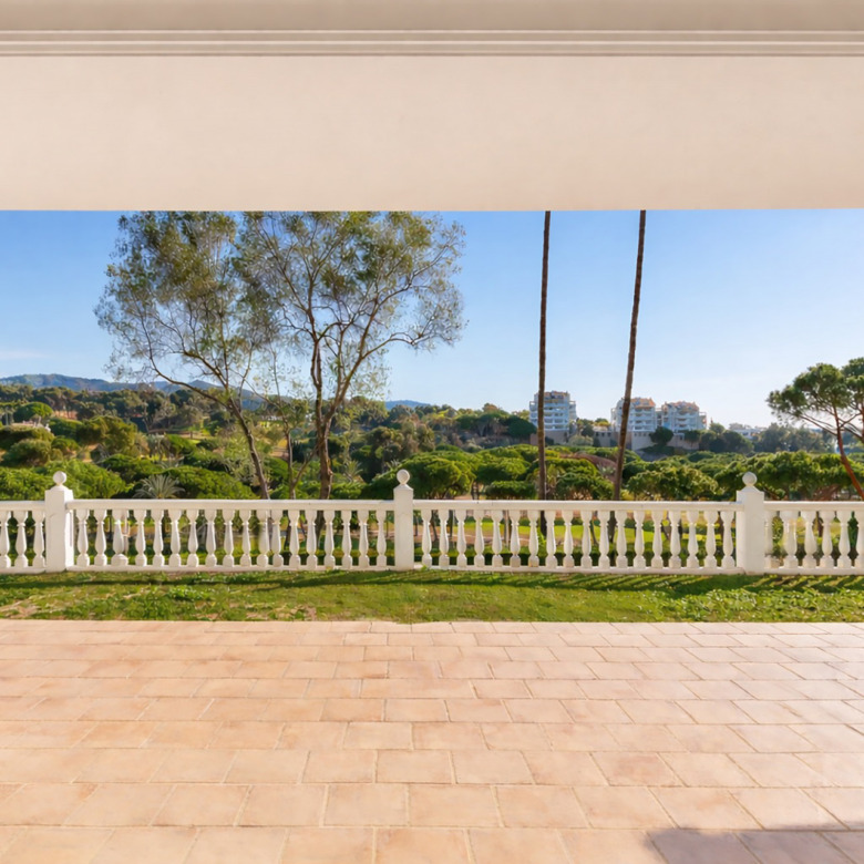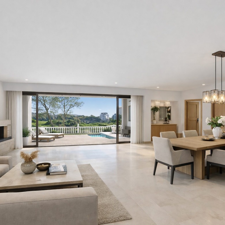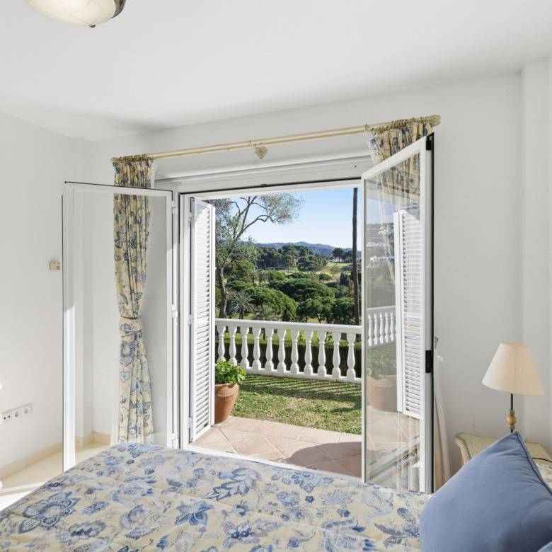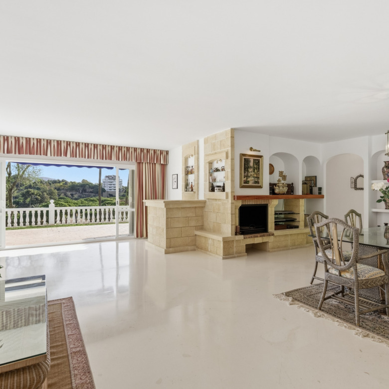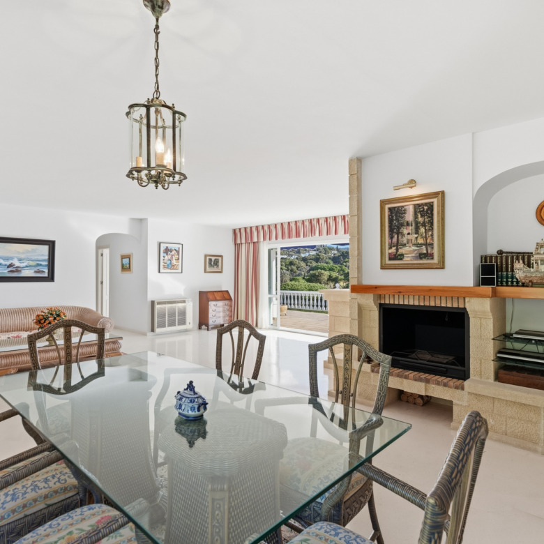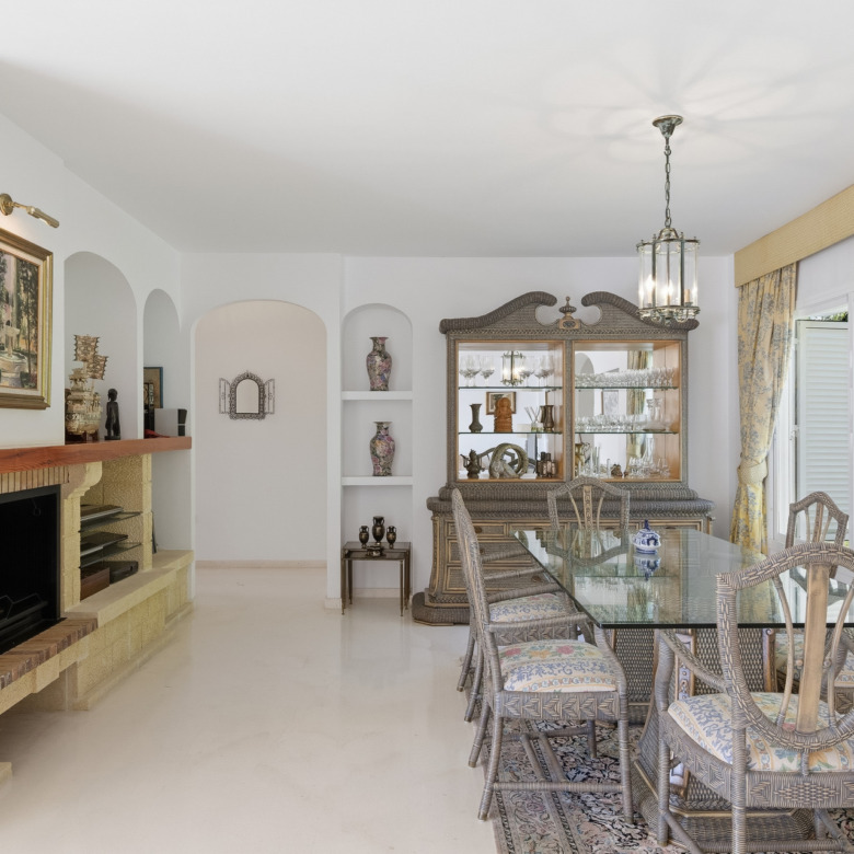 El amplio salón-comedor con chimenea y grandes ventanales se abre directamente a una espaciosa terraza cubierta con agradables vistas al campo de golf y a las zonas verdes, creando un espacio perfecto para disfrutar del clima de Marbella durante todo el año. La vivienda también dispone de cocina independiente con zona de comedor.