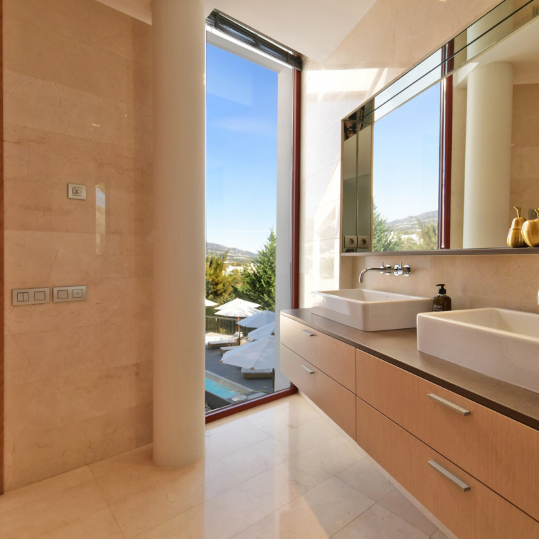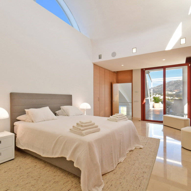 Sus 7 dormitorios se encuentran bien separados para conseguir una total privacidad. Encontrará dos dormitorios principales en el segundo nivel con acceso al bar y al salón. El impresionante dormitorio principal es espacioso, con un gran baño en suite y vistas al valle y al mar. La planta baja incluye 5 dormitorios con 6 camas king size y 4 baños en suite, todos con acceso a la terraza y a la zona de la piscina. También encontrará un gimnasio al aire libre y un salón, así como una sala de cine y de juegos.