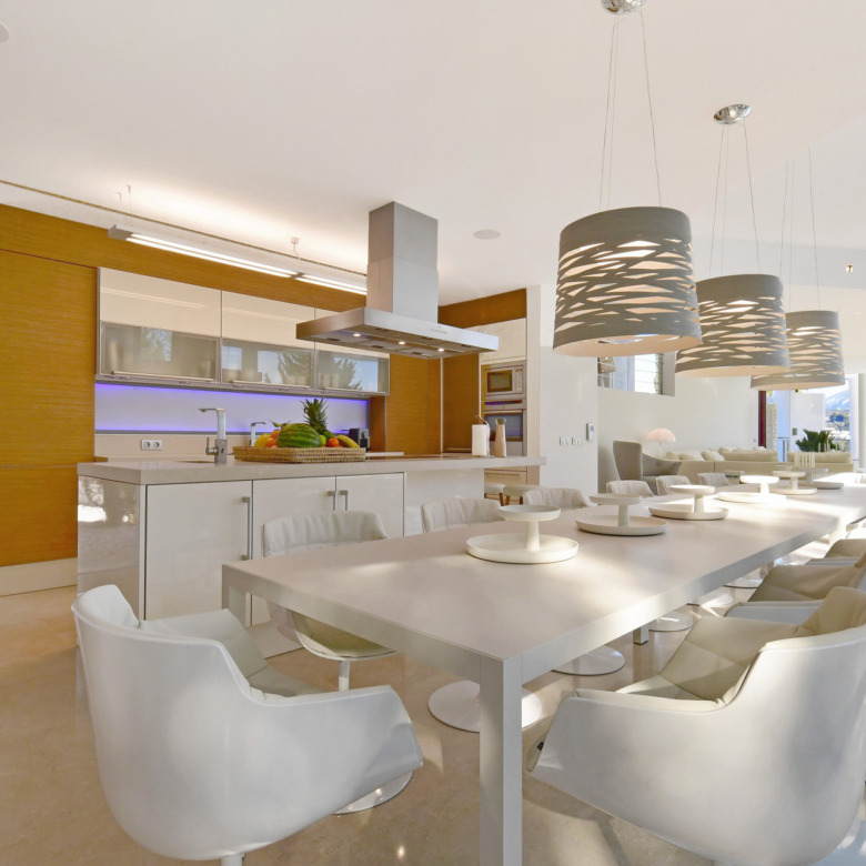 Desde la entrada principal, el salón con su interior blanco flota junto con la hermosa luz natural que entra por los amplios ventanales que dan acceso a la zona de la piscina. hacia la derecha encontramos la cocina totalmente equipada con zona de comedor para 16 personas. Desde aquí hay acceso directo a la segunda cocina y al lavadero.