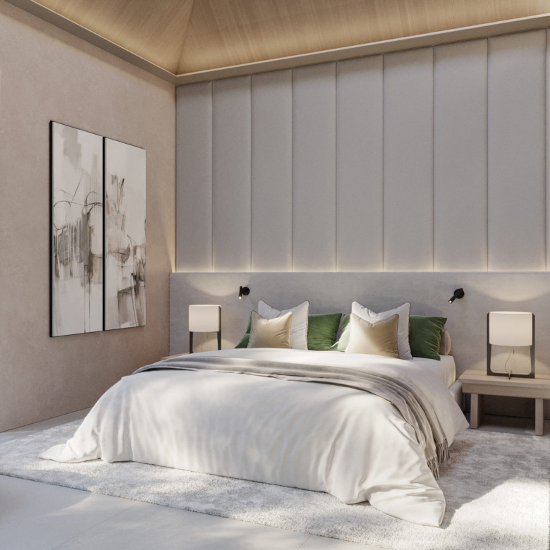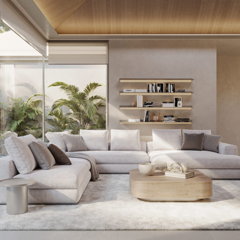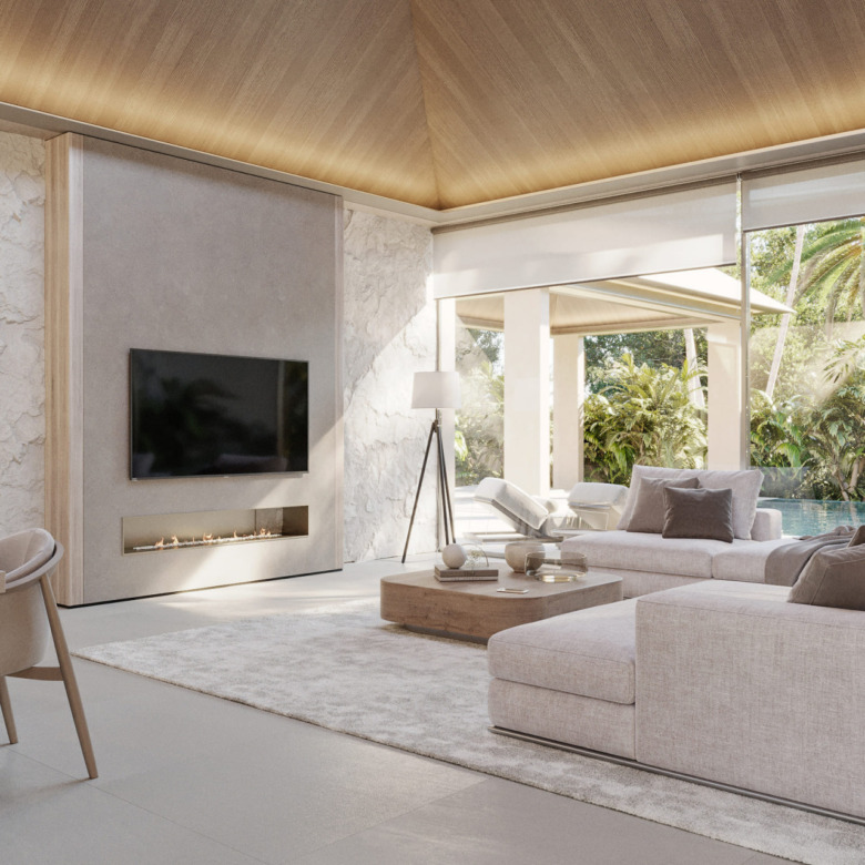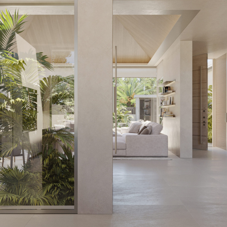La arquitectura moderna de Villa Zen integra los ambientes interiores y exteriores con gran naturalidad, gracias a sus amplias puertas acristaladas y distribución de planta abierta. Esto genera una atmósfera luminosa, espaciosa y llena de armonía.